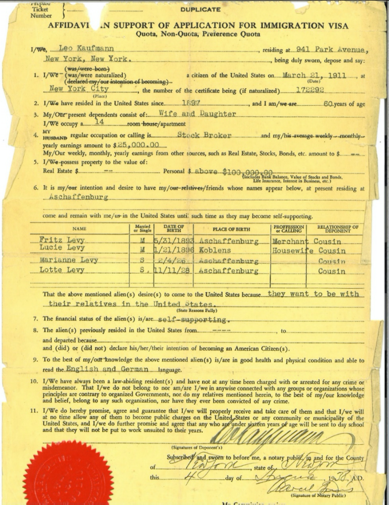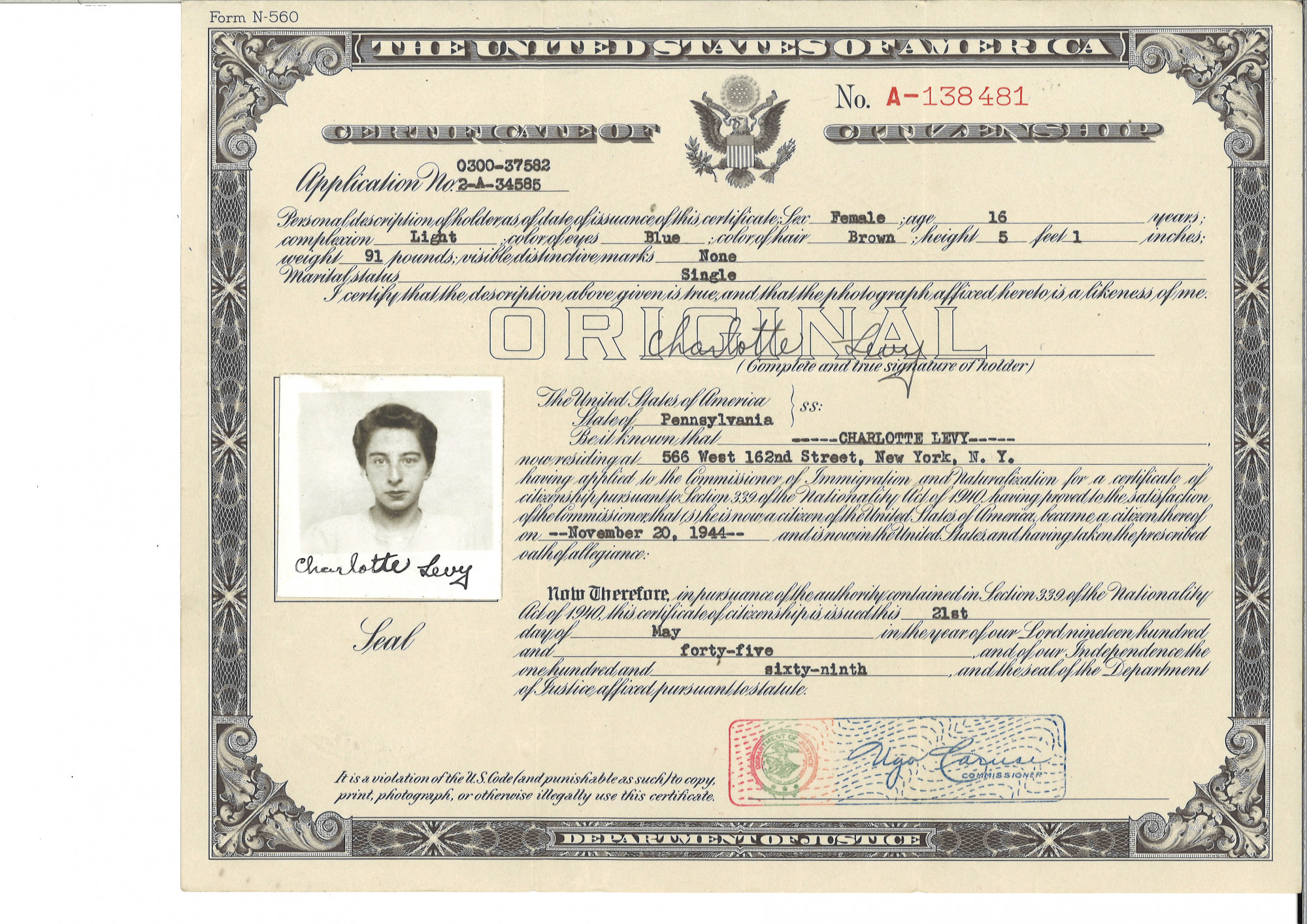 In 1938, her family secured sponsorship from a relative who had already immigrated to the U.S. On their way to leave the country, they stopped in Koblenz, Germany to see her grandfather. On the night of November 9th, their grandfather’s home was vandalized in what would later be known as Kristallnacht. While reporting this crime to the police, her father was arrested again. He was released only when he showed proof they were leaving the country.