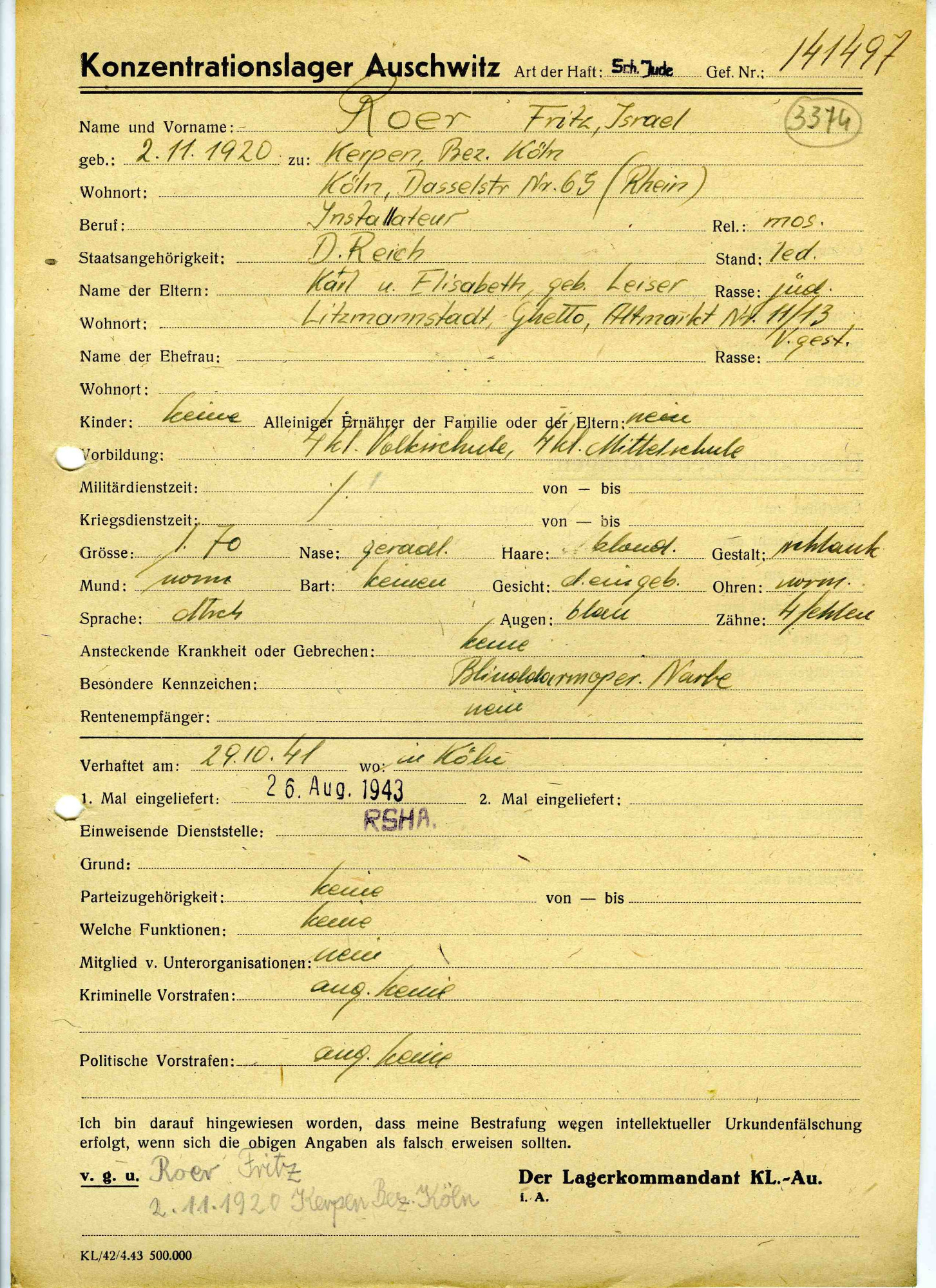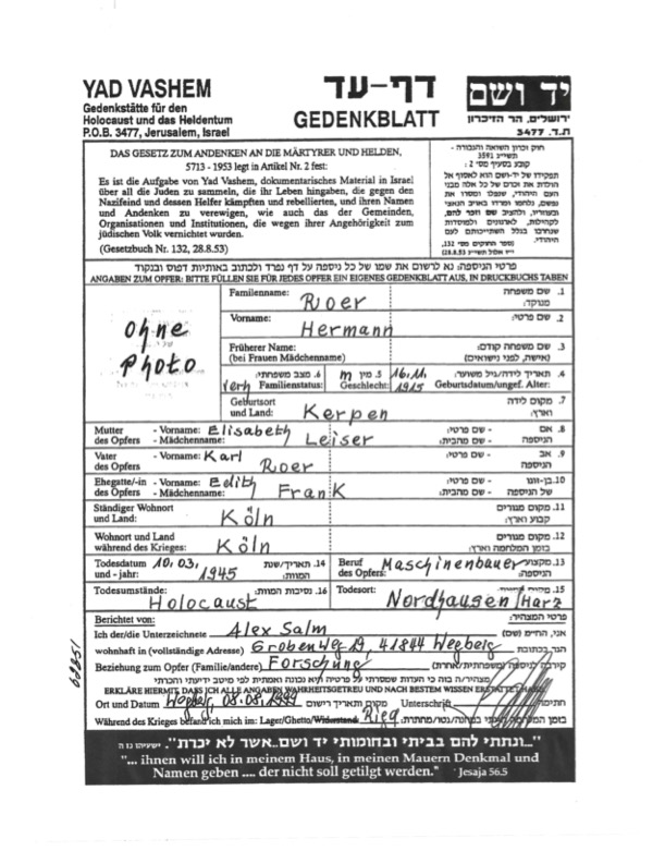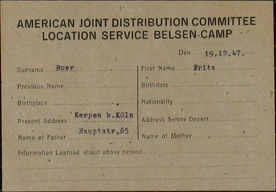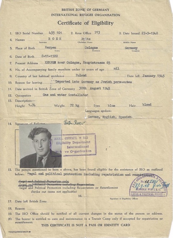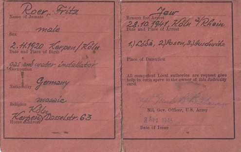 Fred Roer was born on November 2, 1920, in Kerpen, Germany, a small town with a Jewish community of only about thirty families. His mother’s and father’s families had lived in the area for many generations. Fred grew up in a middle-class household with his parents and his older brother, Hermann. The family owned a successful business that installed gas, water, and electric systems and sold household appliances. Fred often remembered his childhood as happy and full of normal activities. He attended school with both Jewish and non-Jewish students. From the age of seven, he played on soccer teams with friends from both communities, a passion he carried throughout his life.