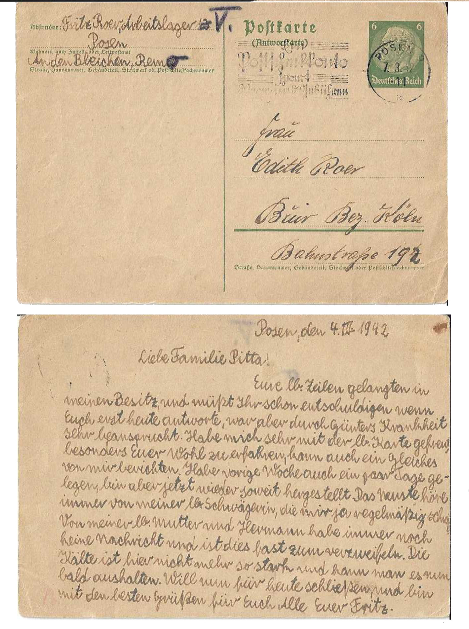 In October 1941, Fred and his family were deported to the Lodz Ghetto in Poland. He was separated from his mother and brother and sent to a forced labor camp in Poznan. From 1941 to 1943, Fred dug irrigation ditches and helped excavate a massive man-made lake. The project was part of the Nazis’ plan to create a “show city” that glorified the German Reich. When the project ended, Fred was deported to Auschwitz, arriving on August 27, 1943. He was assigned to the Janinagrube subcamp and forced to work in a coal mine. In January 1945, as the Soviet army approached, he was forced to march from Gross-Rosen and then to Regensburg. He was finally liberated by the U.S. Army near Mauthausen at the German-Austrain border.