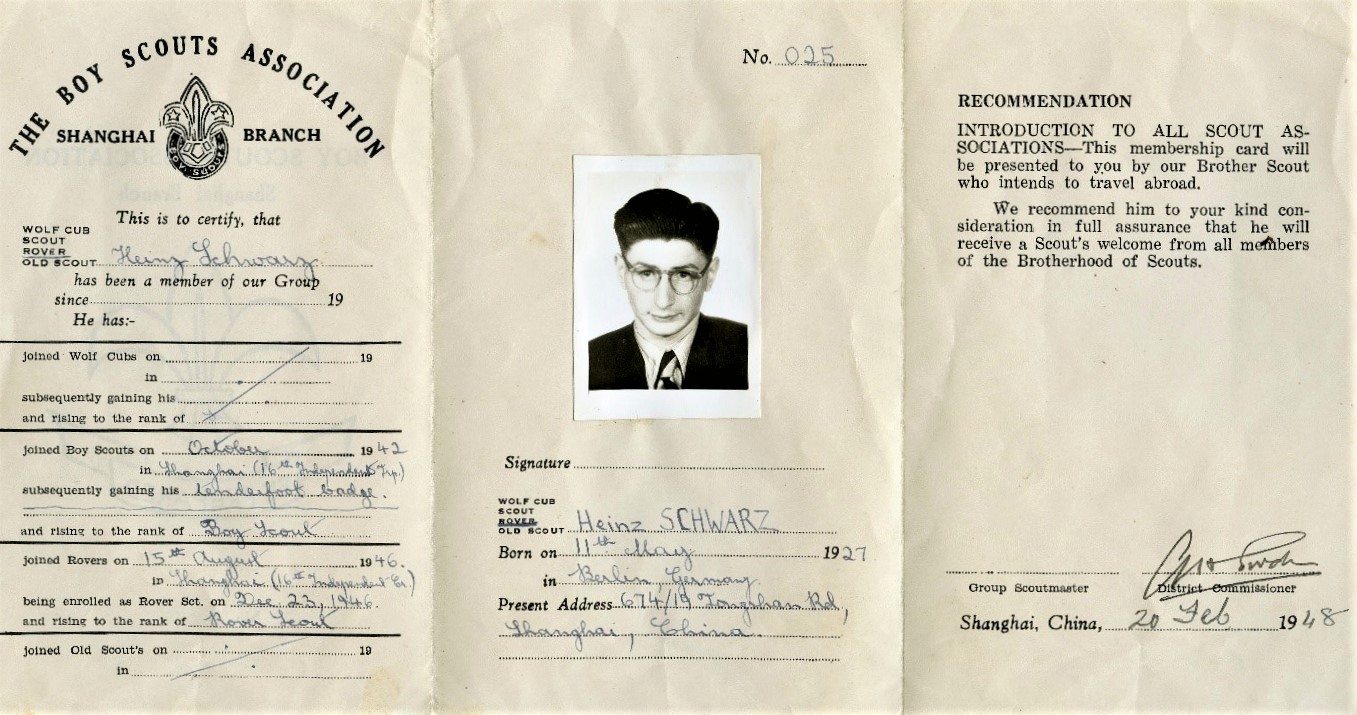 Heinz Schwarz, circa 1940 Heinz Schwarz was born on May 19, 1927, in Berlin, Germany. Fearing for their lives, Heinz and his parents Walter and Elizabeth fled to Shanghai in April 1939. Heinz turned 12 during the two-month journey. Jewish refugees in Shanghai survived in cramped and unsanitary conditions. Still, Heinz was able to attend a Jewish school and even joined a Boy Scout troop started by the refugee community. After the war, the family unsuccessfully tried to contact relatives in Germany. Tragically, all had been killed in the Holocaust.