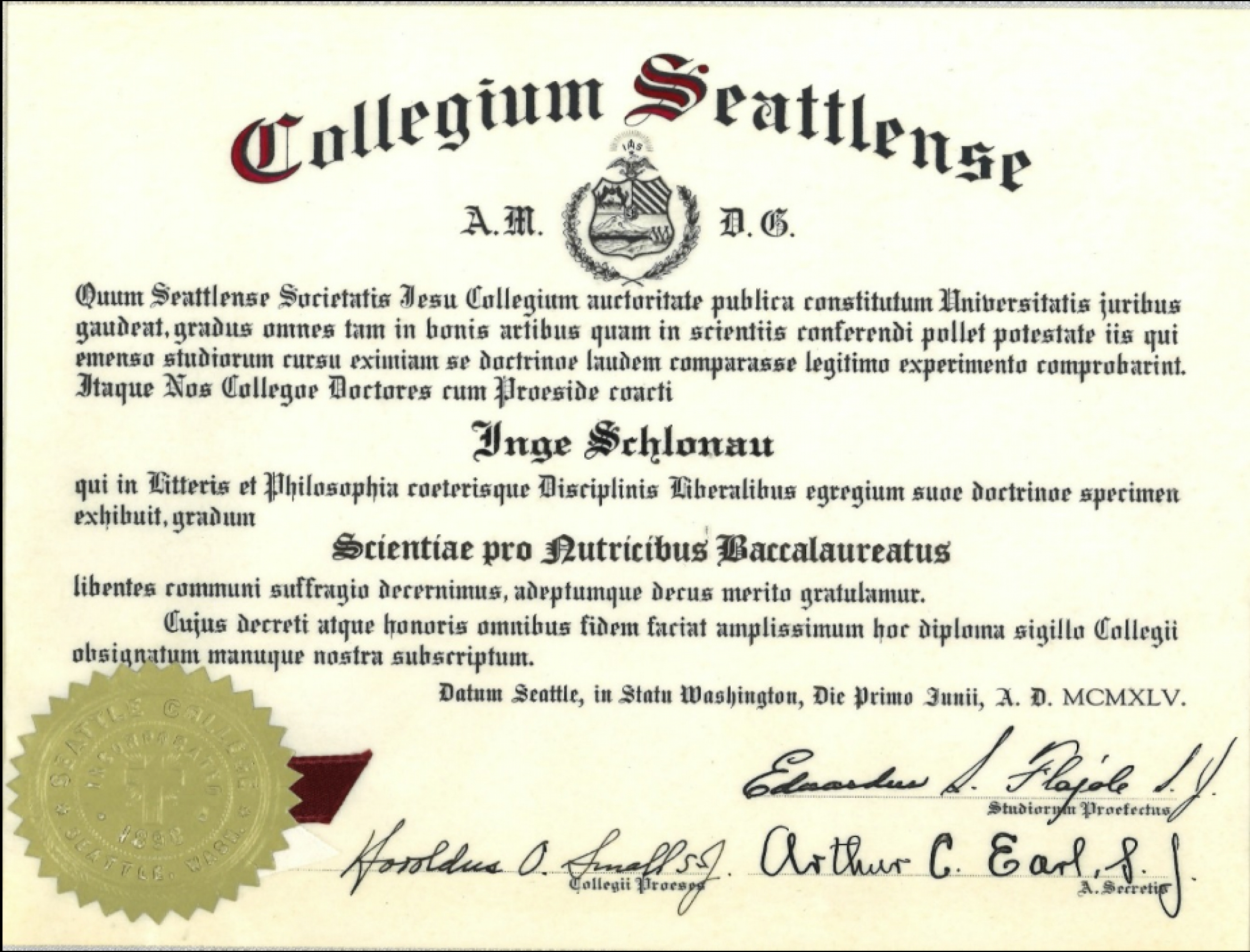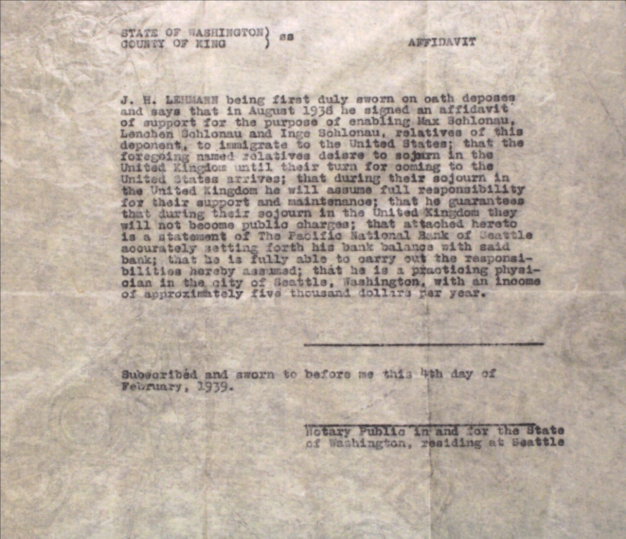 By 1938 they had made plans to leave Germany. Helene had a cousin who was already settled in Seattle, Dr. Hans Lehmann. Lehman provided the Schlonau’s with an affidavit. Due to Max’s agricultural experience, the family was able to expedite the visa process for entry into the United States. They sailed from the Netherlands on September 1, 1939. The Schlonaus settled in Seattle where Dr. Lehmann was a prominent physician. Other family members also saved by Lehmann also made their homes in Seattle.