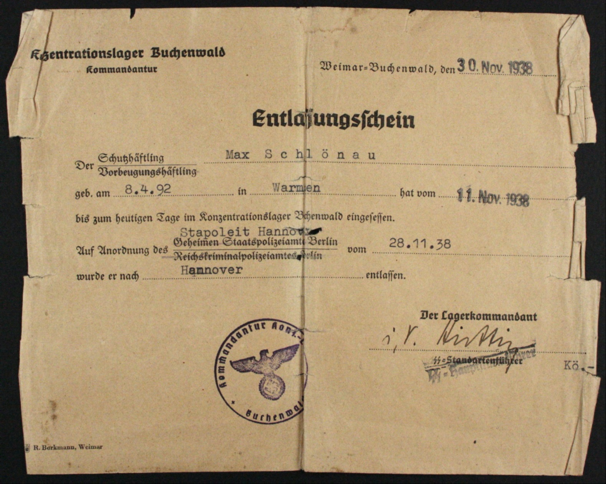 Max and Helene married in 1923 and their daughter, Inge, was born in 1924. After 1933, when Hitler became Chancellor of Germany, life got progressively more difficult for the Schlonaus. Inge had to take a 5-hour train ride to Hanover, Germany where she lived in an orphanage during the week in order to go to a Jewish school because Jewish students were not allowed in German schools. Max was arrested on Kristallnacht in 1938 and held at Buchenwald Concentration Camp for 3 weeks until his wife, Helene, paid a ‘fine’ to get him released.